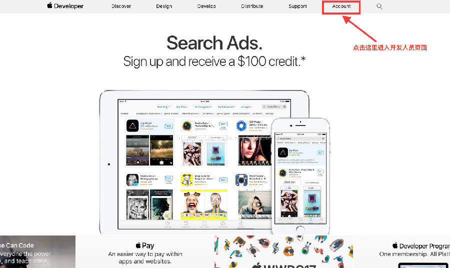 2、进入开发者页面,地址: https://developer.apple.com/,点击下图所示按钮进入开发者页面,如果之前未登陆,需要先输入Apple ID登陆。