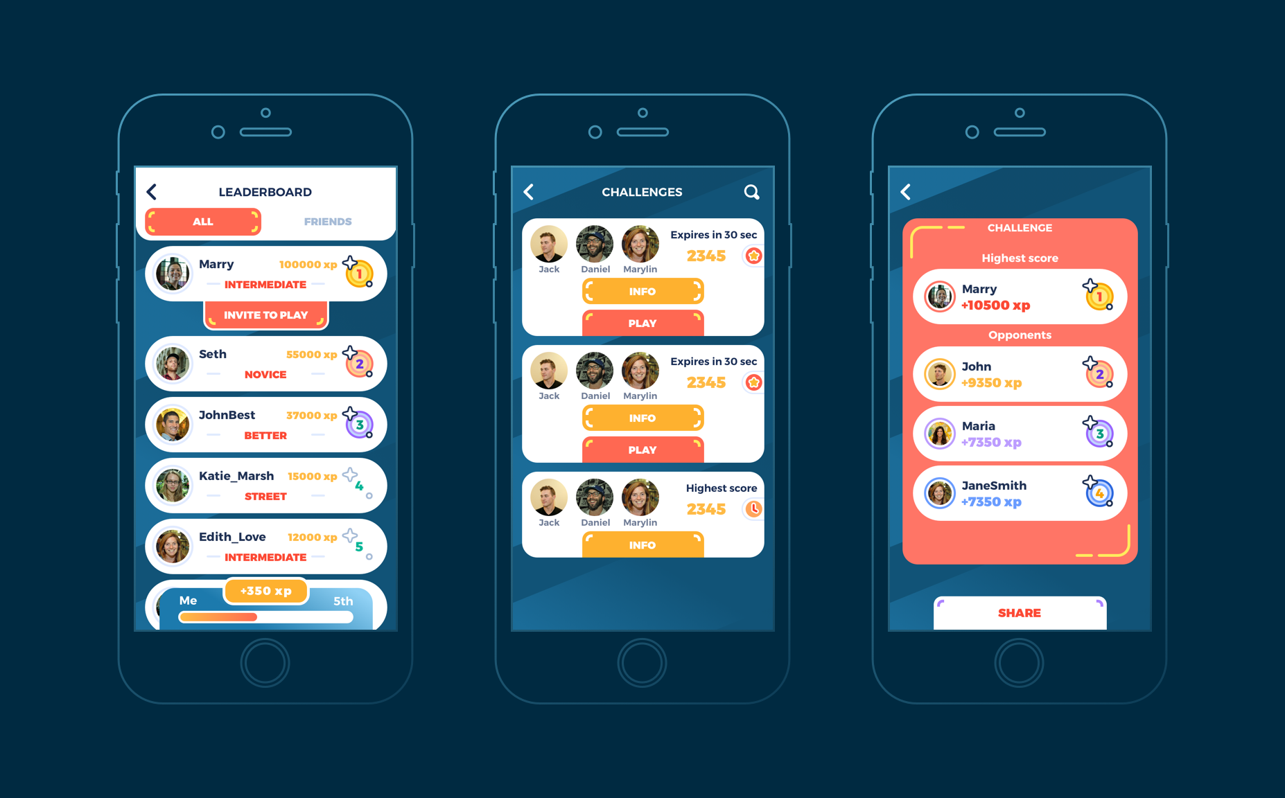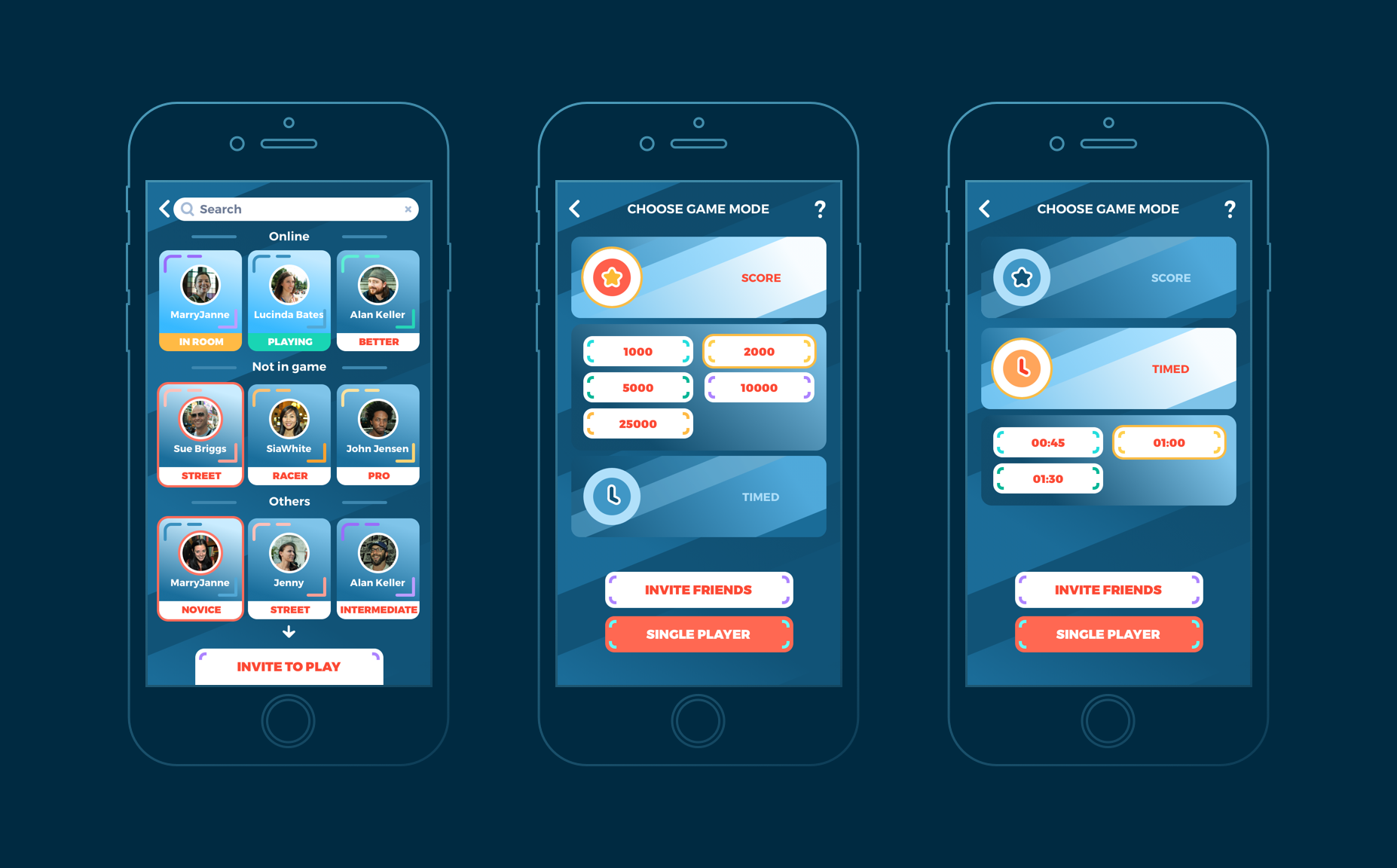 上方的三个界面,分别是多人游戏时玩家准备界面,带有赛程进度条的游戏过程界面,以及完成比赛之后的结果界面。用户在完成比赛之后可以从比赛结果界面,直接将结果分享到社交网络上,这对于游戏的传播有很好的效果。「You Win」的字体可能看起来不够有张力,这个可以在测试之后再进行调整和迭代。