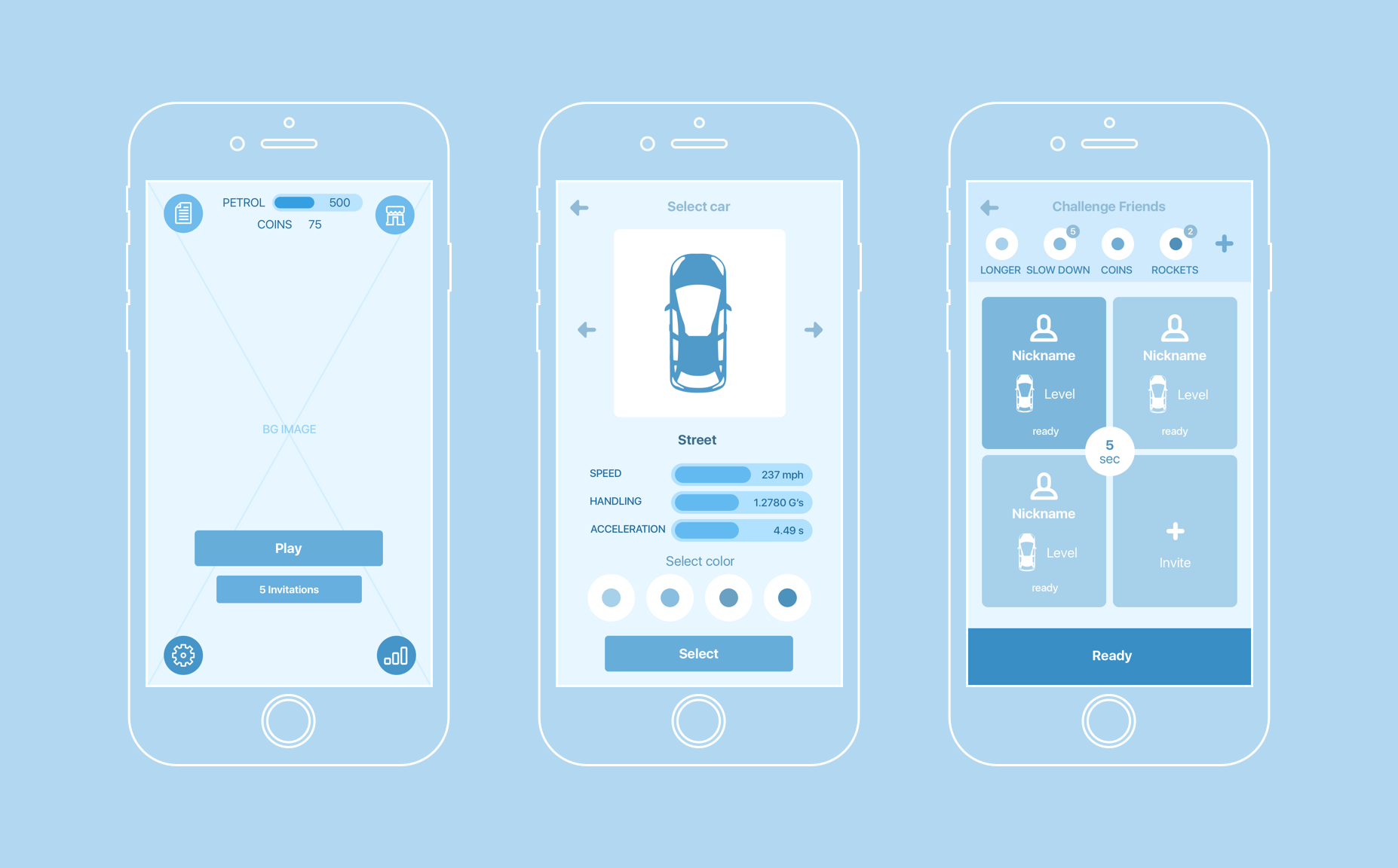 整个游戏的 UI 设计是从线框图设计开始的。设计师在这个阶段会构思好基本的交互和导航的设计。在打磨外观视觉设计之前,单色的线框图框架让设计师更好地思考布局和界面之间的过渡。没有图片和动效,只有基本的图标和排版布局,这样的情况下,设计师能够更加专注于交互流程。这里你可以看到 Real Reacing 的一些基本的界面布局: