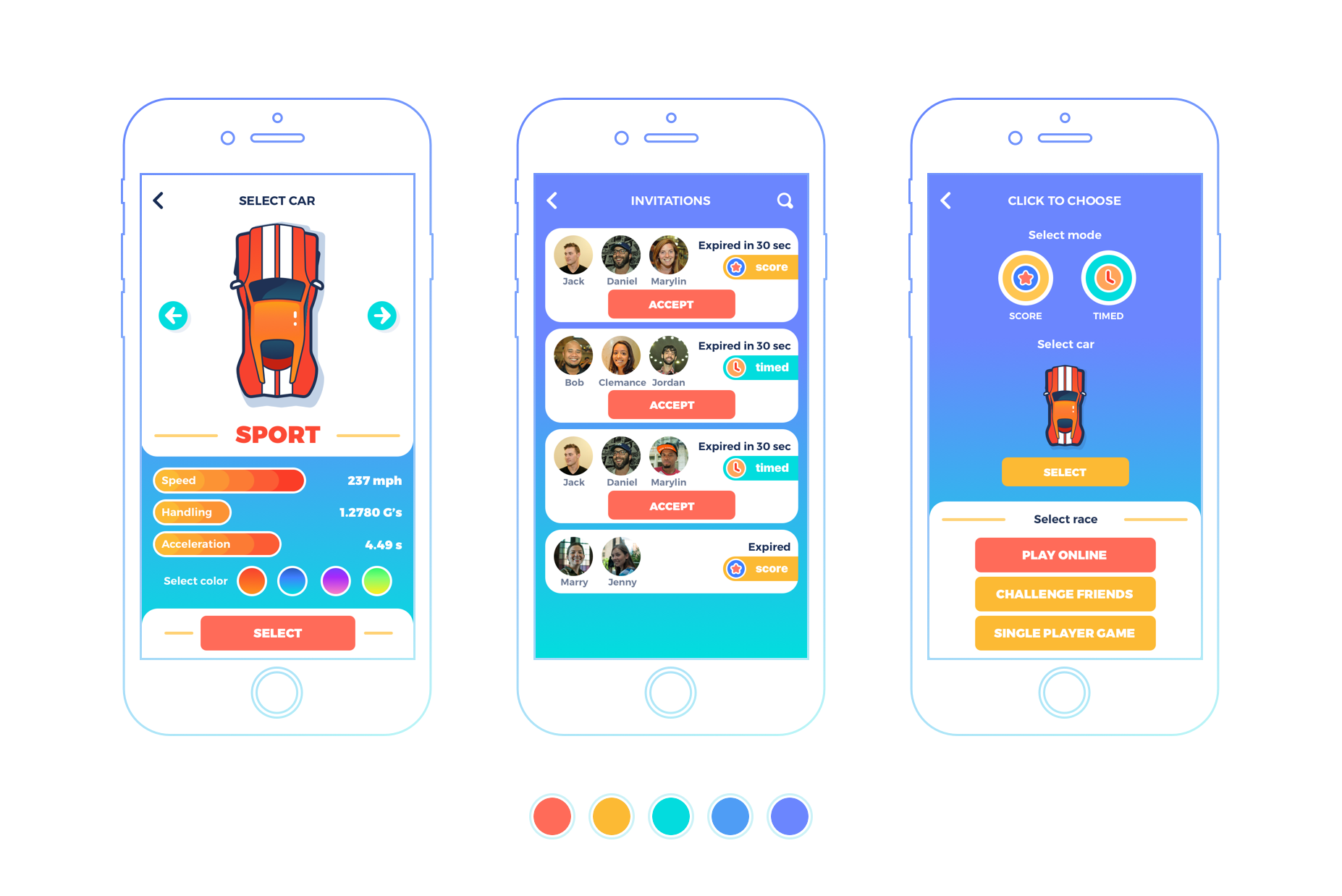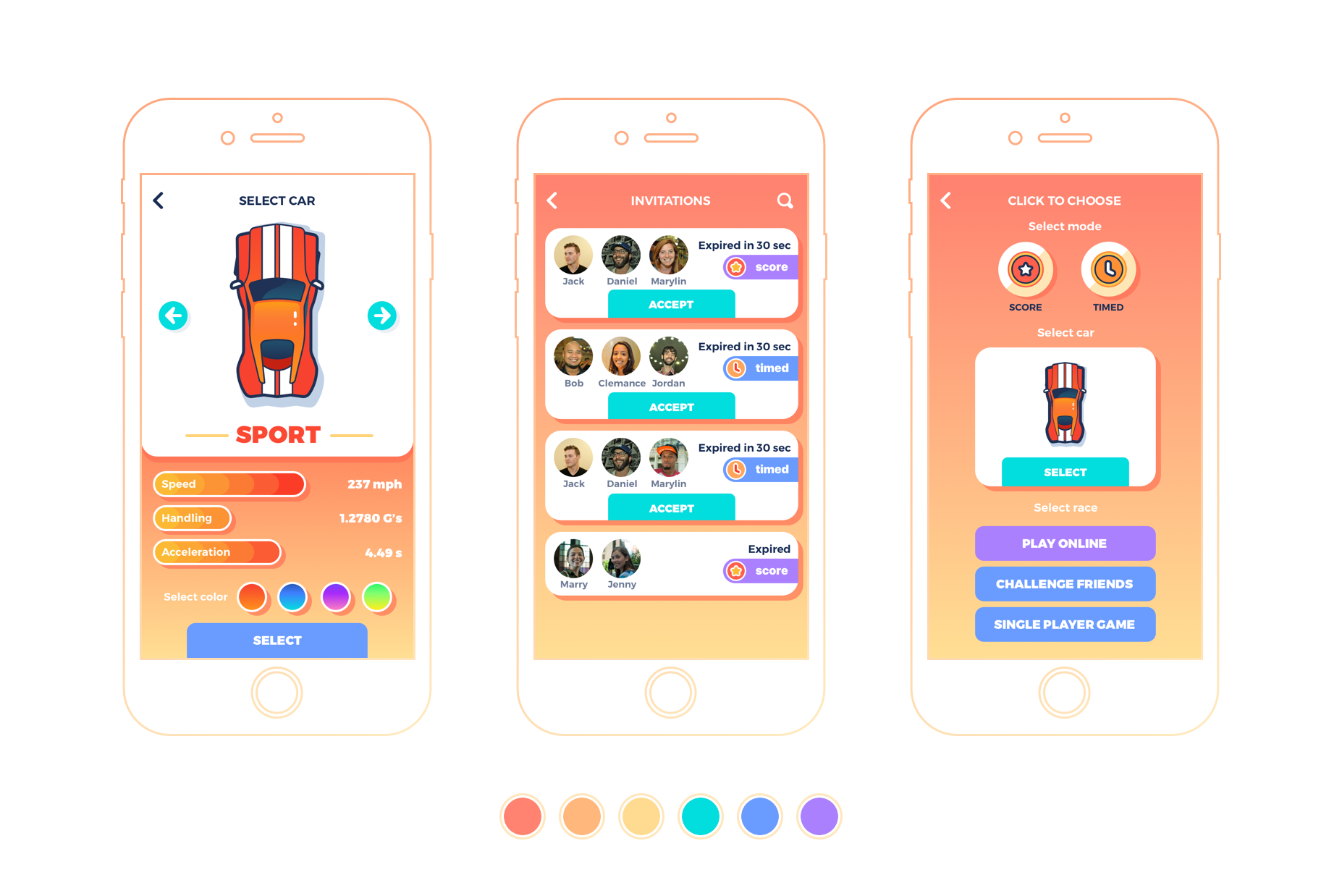 这组界面是用户选择赛车的界面,通过左右滑动选择赛车,并且可以查看相应车型的参数和性能,选择好了车辆以后,用户也可以挑选出所需的颜色。正如你所看到的,设计师采用了色彩混搭式的背景,色彩鲜艳的车辆是白色的背景,而其余的信息则呈现在深色的背景上,这组对比是有趣的,并且让整个界面显得协调而自然。